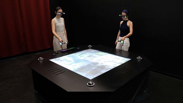 Il movimento degli utenti è tracciato dal tavolo tramite sensori presenti sugli occhiali e l'interazione con il modello è possibile grazie ai controller.